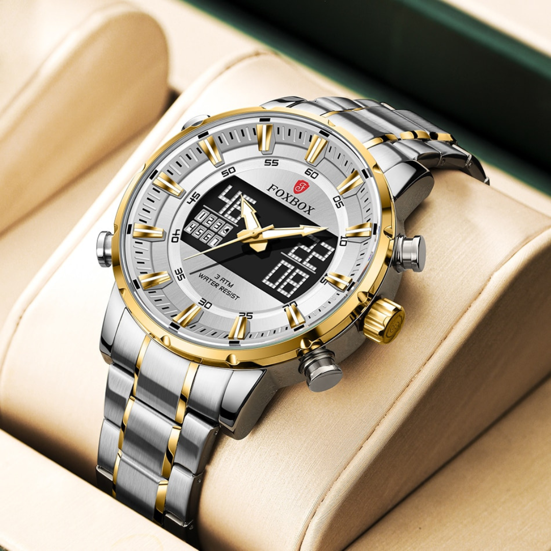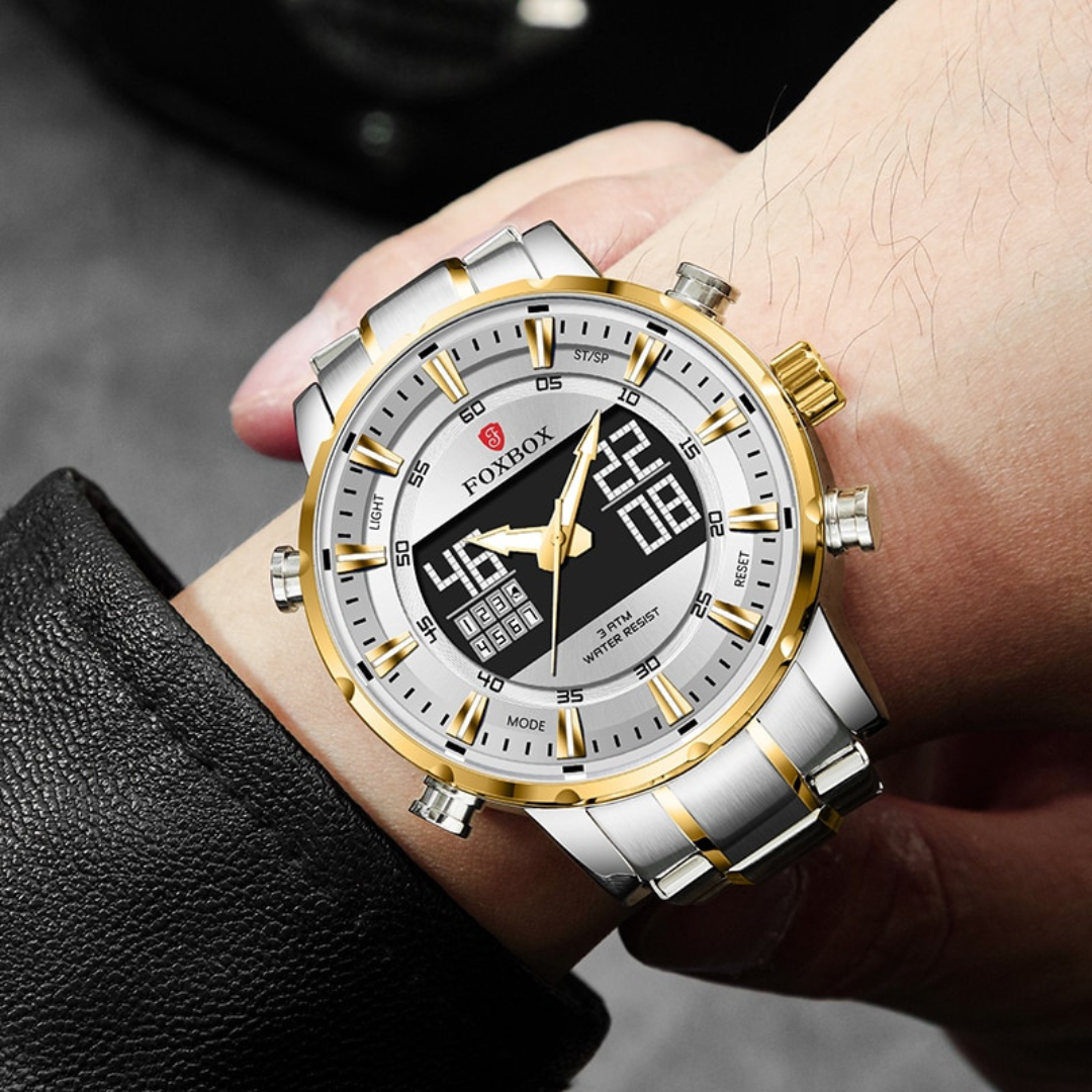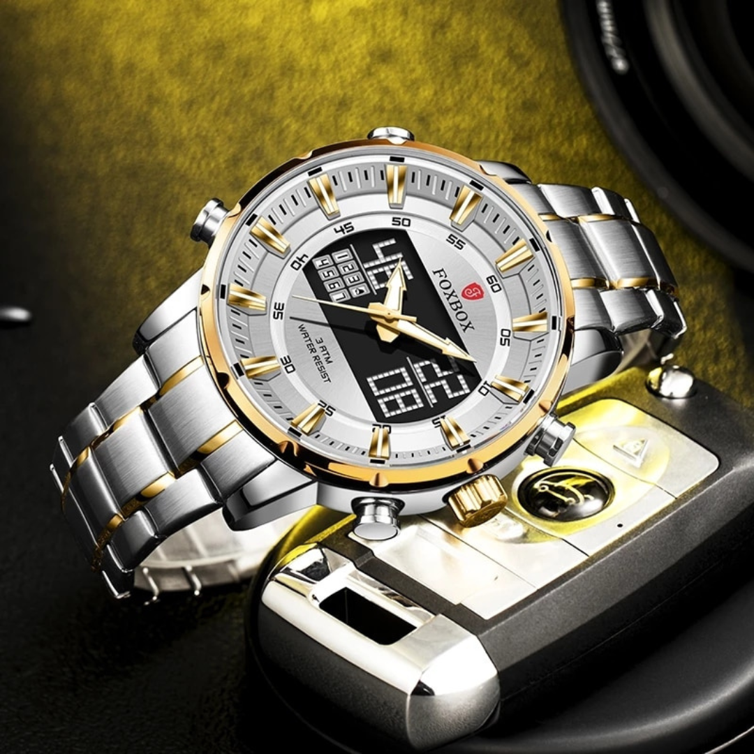 The LIGE Odin bridges worlds. It's a rugged digital-analog hybrid built for ultimate utility, combining a luminous analog dial with a full digital LED display. Packed with a chronograph, alarm, date, and dive-ready water resistance in a substantial 47mm steel case, it’s a feature-dense command center designed for sport, adventure, and anyone who demands information at a glance.
