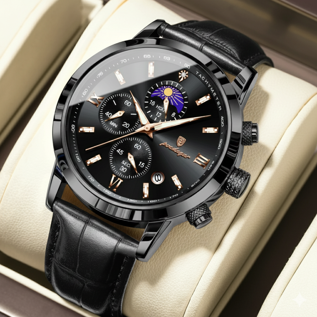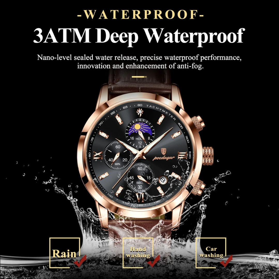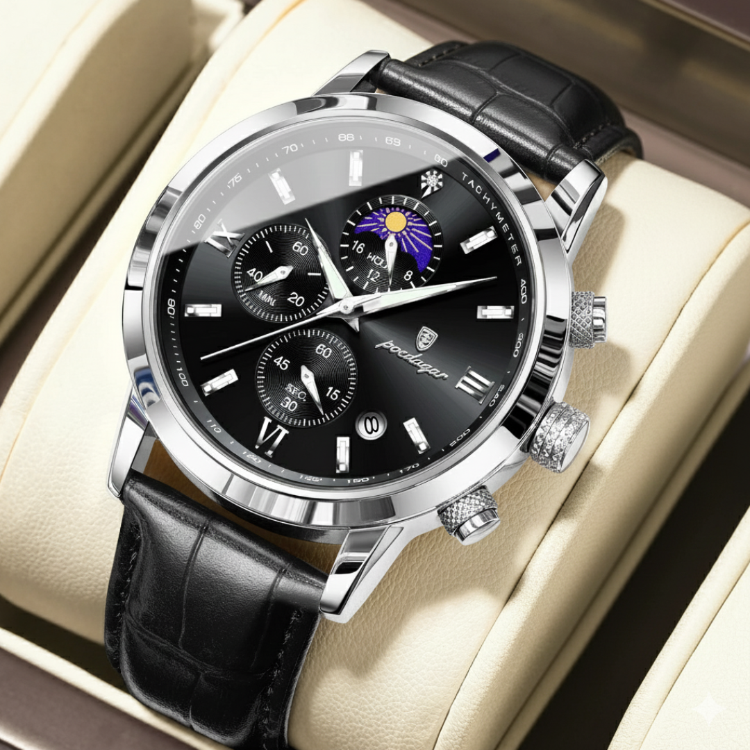 Our timepieces are crafted for the discerning individual who values refined complexity. With scratch-resistant Hardlex crystal, polished stainless steel, and 3ATM water resistance, the Poedagar Elegance masterfully blends classic sophistication featuring Roman numerals and a complete calendar with the practical utility of a chronograph, creating a watch for both formal occasions and organized daily life.