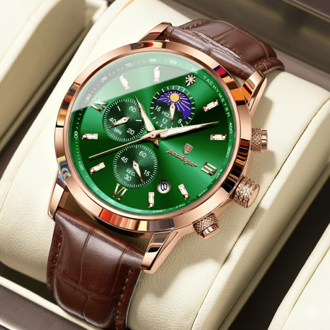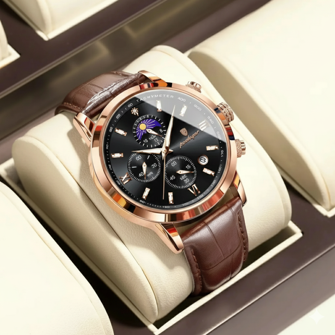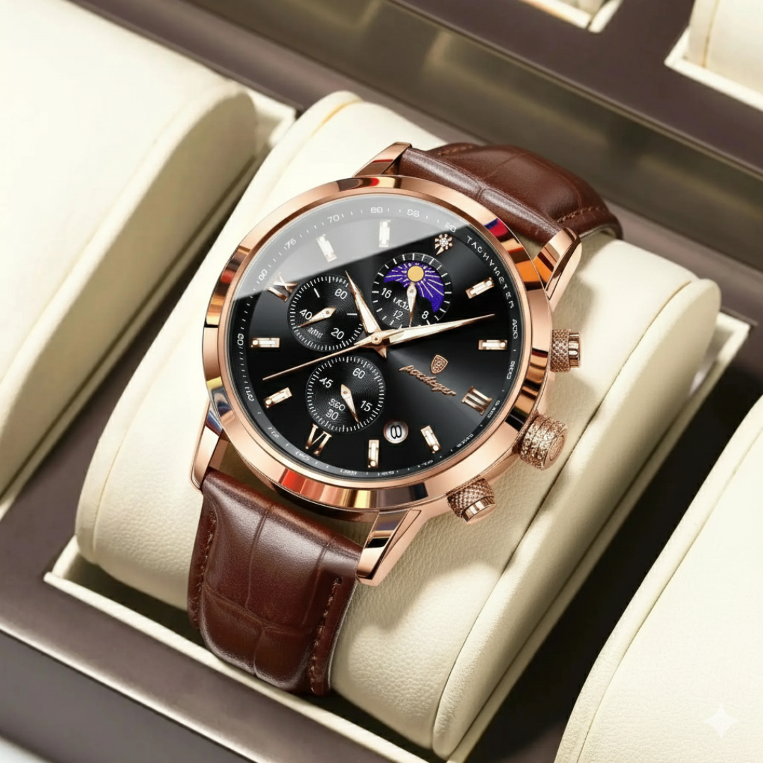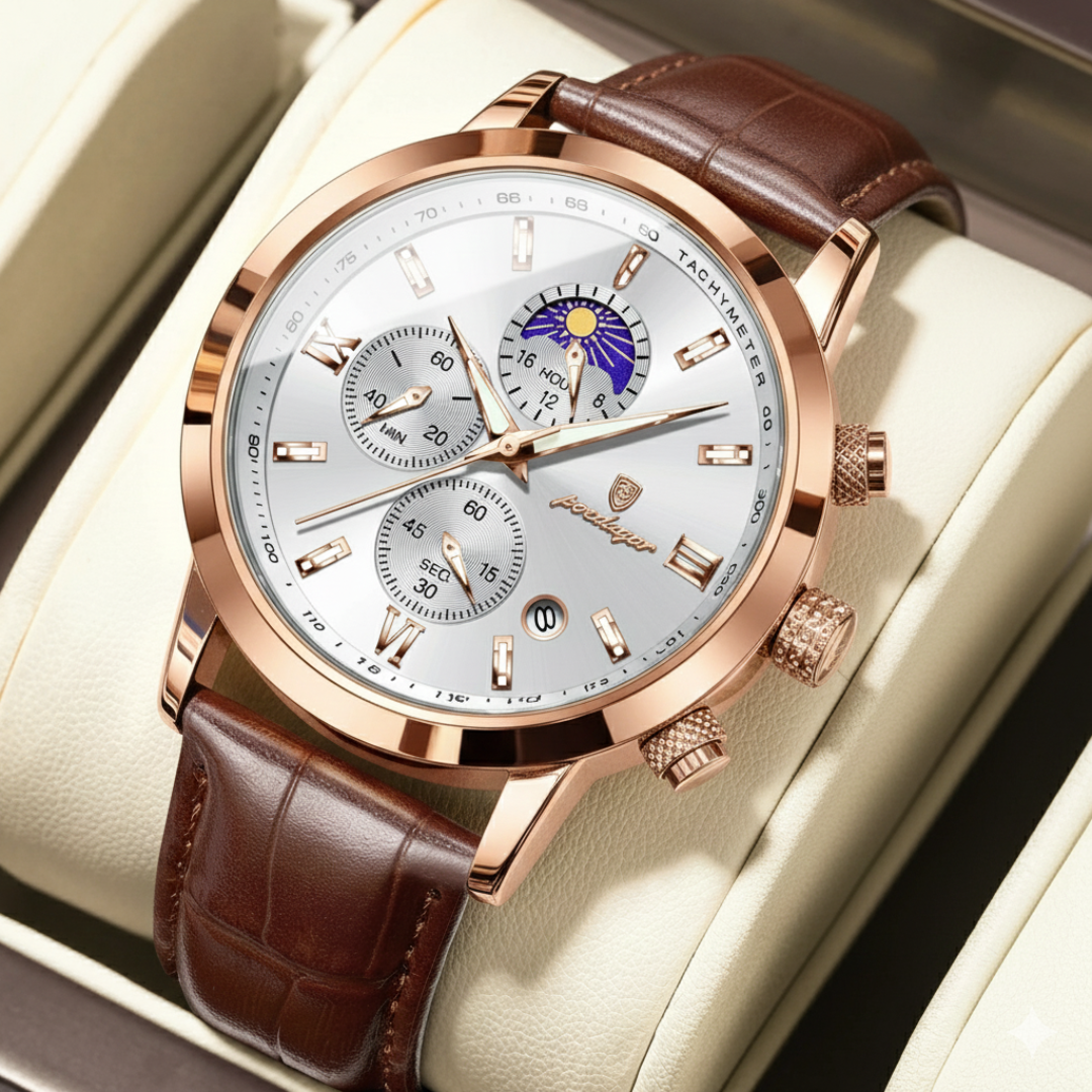 Our timepieces are crafted for the discerning individual who values refined complexity. With scratch-resistant Hardlex crystal, polished stainless steel, and 3ATM water resistance, the Poedagar Elegance masterfully blends classic sophistication featuring Roman numerals and a complete calendar with the practical utility of a chronograph, creating a watch for both formal occasions and organized daily life.