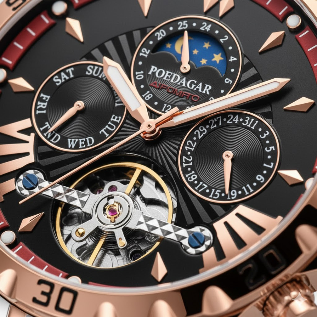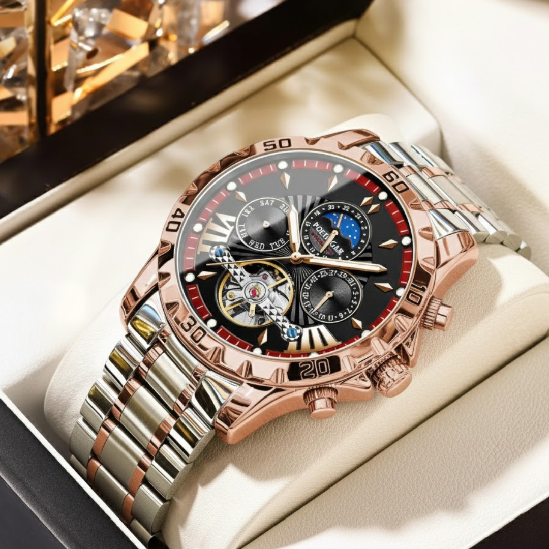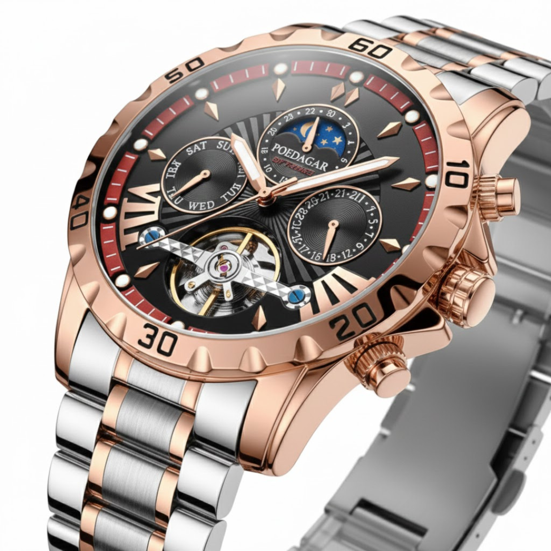 Midnight looks like mechanical art that belongs in a gallery. Its automatic movement with tourbillon is a refined spectacle, engineered to captivate and last. It commands attention as a statement piece for sophisticated occasions or when artistry is the focus. It's confident horology on the wrist, designed to be admired and understood.