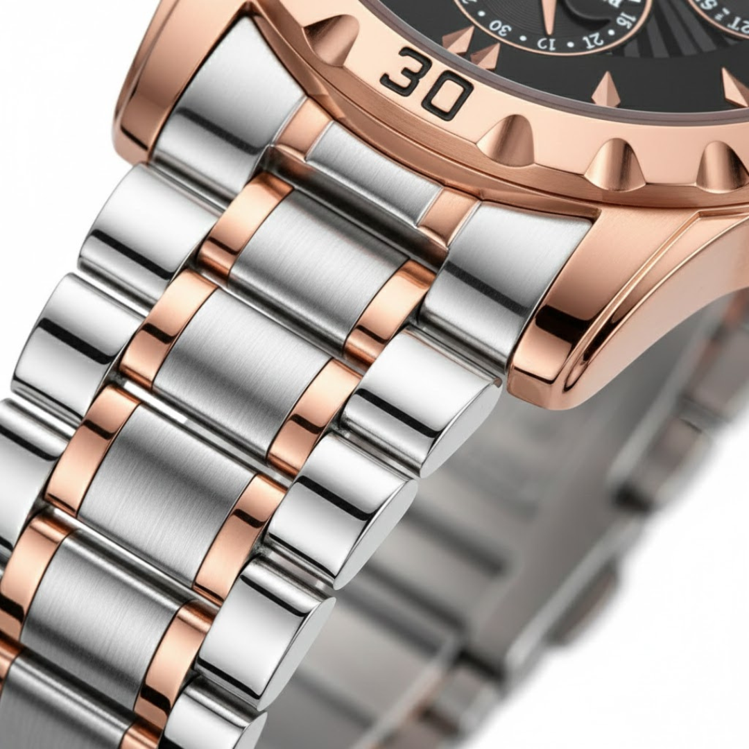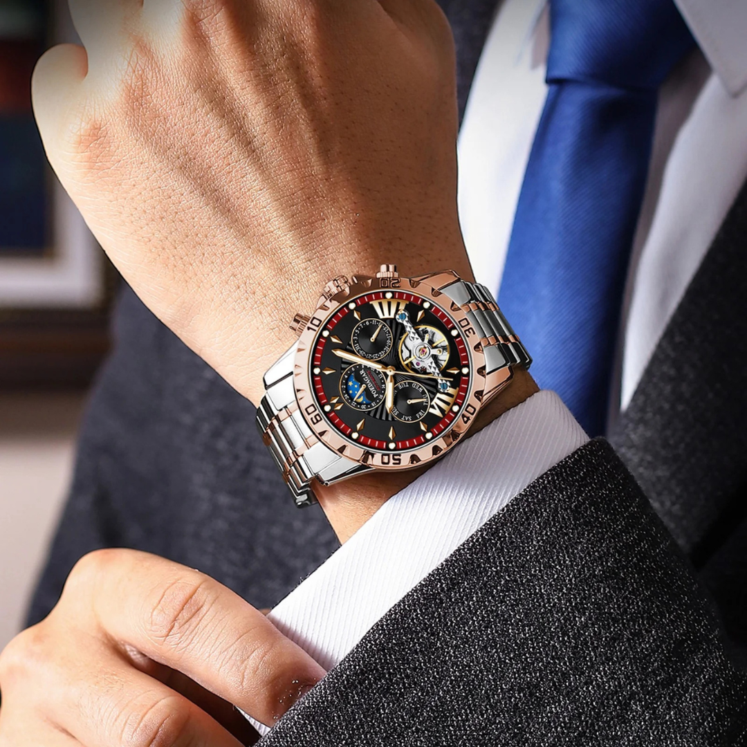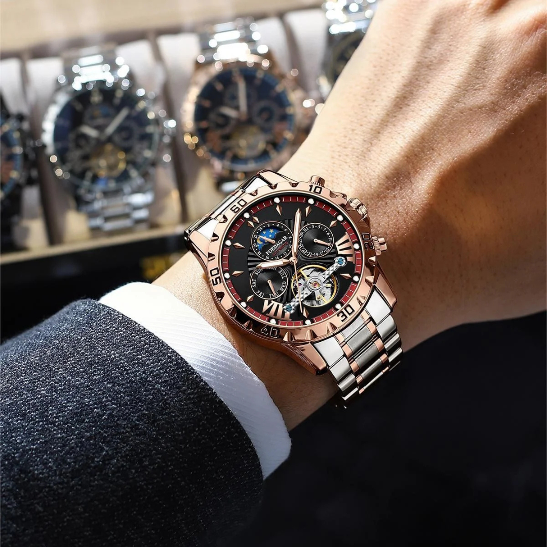 Midnight looks like mechanical art that belongs in a gallery. Its automatic movement with tourbillon is a refined spectacle, engineered to captivate and last. It commands attention as a statement piece for sophisticated occasions or when artistry is the focus. It's confident horology on the wrist, designed to be admired and understood.