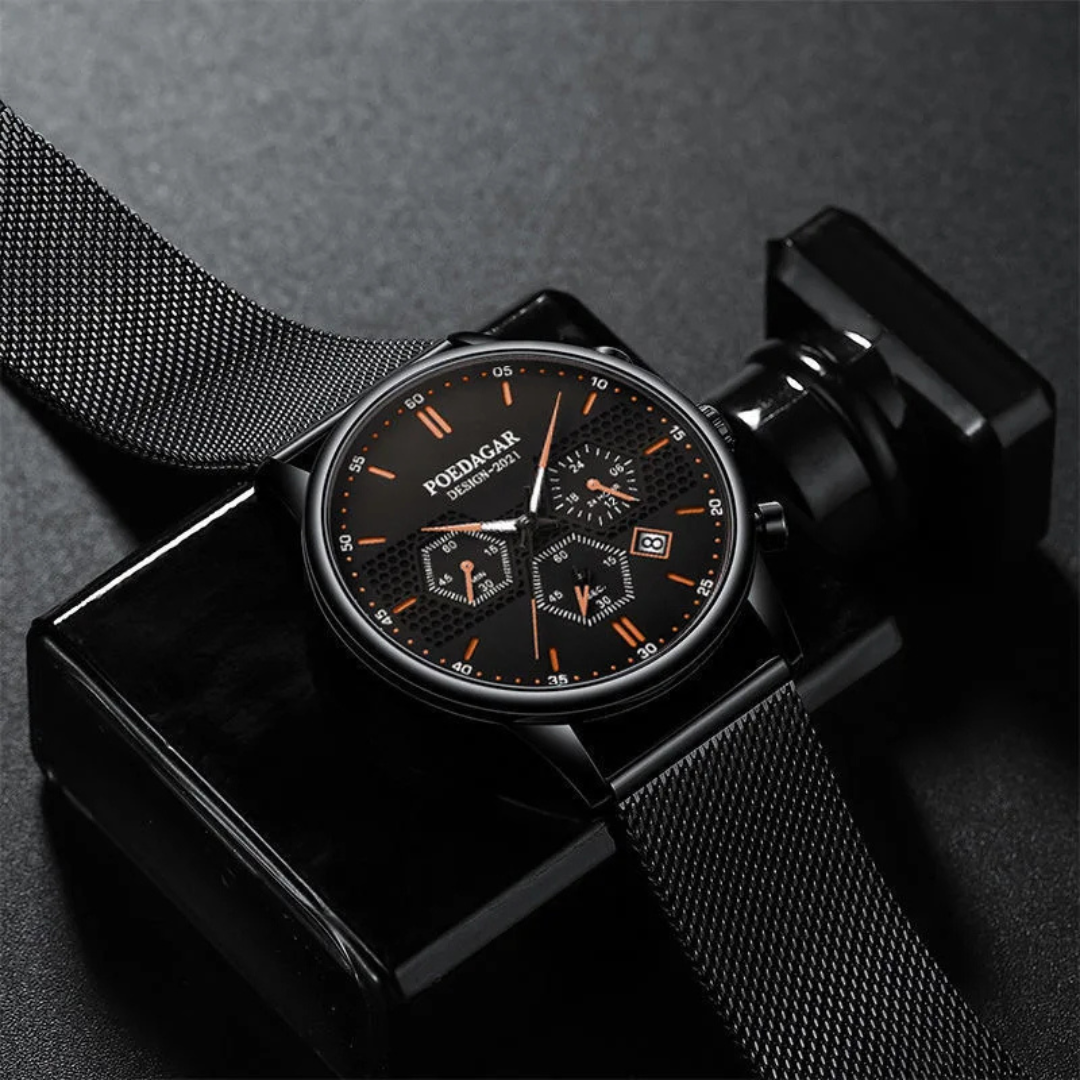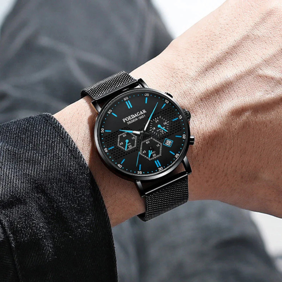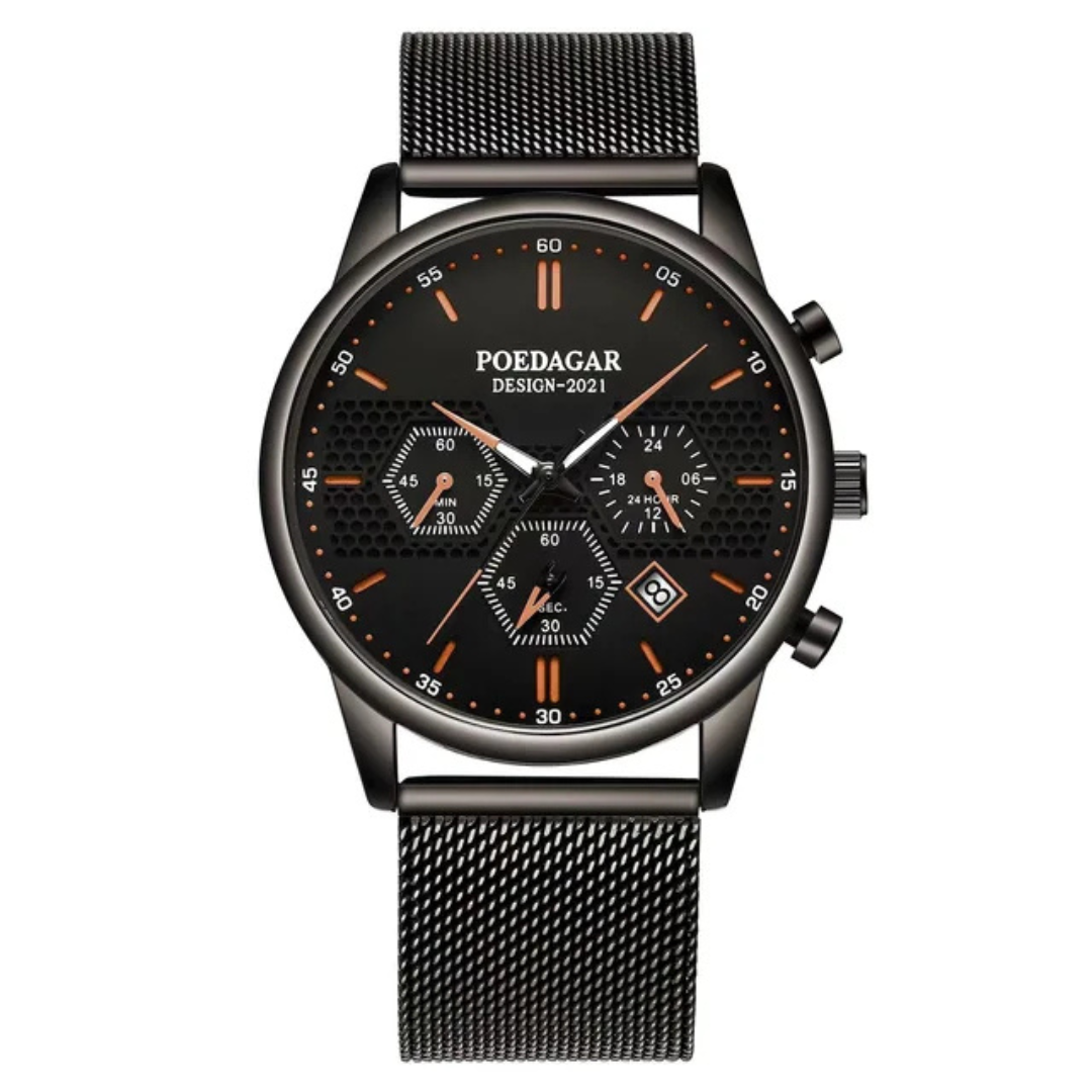 The Poedagar Shadow defies expectations. In an exceptionally slim 8mm case, it integrates a sophisticated chronograph and a complete calendar, delivering high-level utility without the typical bulk. This masterclass in compact engineering offers a refined, versatile, and surprisingly feature-packed timepiece for the discerning wearer who values both sophistication and substance.