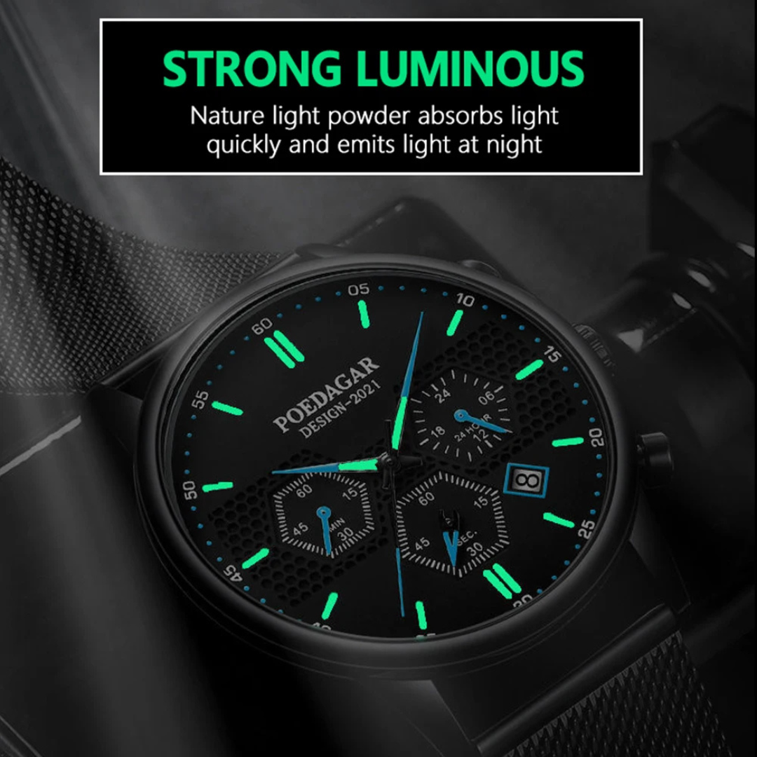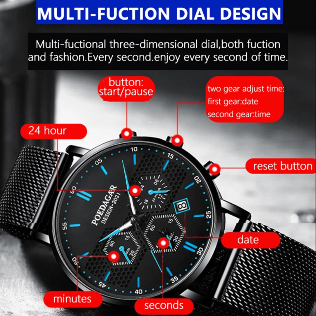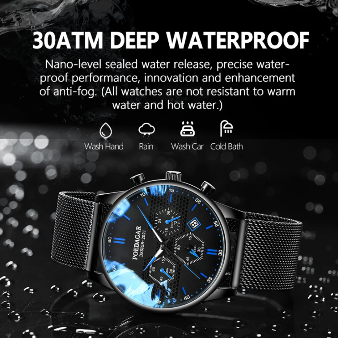 The Poedagar Shadow defies expectations. In an exceptionally slim 8mm case, it integrates a sophisticated chronograph and a complete calendar, delivering high-level utility without the typical bulk. This masterclass in compact engineering offers a refined, versatile, and surprisingly feature-packed timepiece for the discerning wearer who values both sophistication and substance.